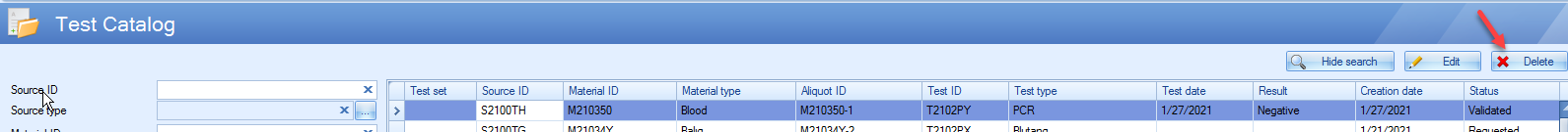 To delete a test, go to Test Catalog, find the test which should be deleted and click on Delete button. Tests can be deleted only one by one.