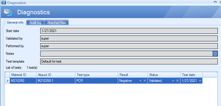 In our example, the test, which we have deleted, was performed in Diagnostics operation and was in status Validated.